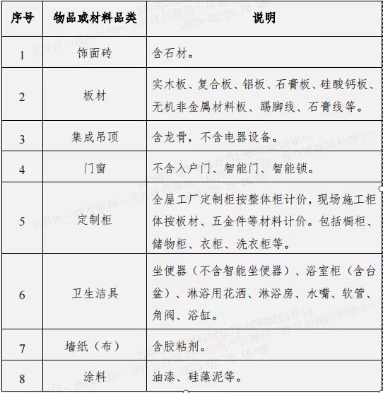 个人消费者购买用于旧房(2023年1月1日前竣工验收合格的住房)装修和厨卫等局部改造所需的饰面砖(含石材)等8类物品材料(详见附表),按照上述品类实际购买价格的15%给予补贴,每位消费者且每套房最多可补贴1次,不超过2万元。