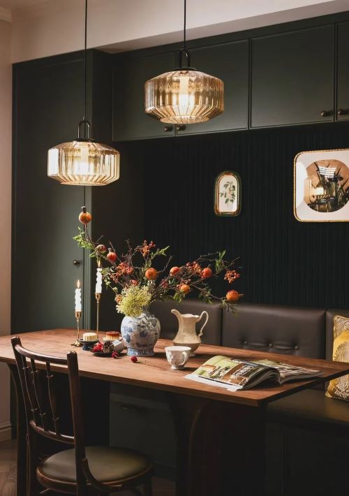 卡座设有深灰色软包靠背,不仅耐脏且百看不腻。下方是储物空间,屋主的红酒、鸡尾酒之类的会存放在这里。墨绿色柜体与墙面相融合,融入泛着光泽感的同色系绒布,质感奢华又高级,不禁使人联想起经典的老上海旗袍。辅以明黄色靠包和中国风装饰画作为点缀,尽显东方元素之美。
