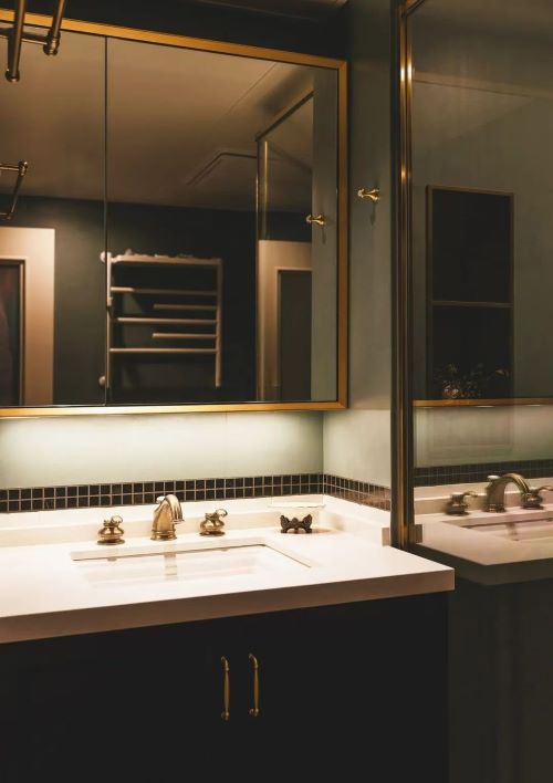 温柔又细腻的复古绿色系装修,墙面同色调艺术漆搭配黑色马赛克腰线,地面通铺小花砖,搭配和谐,色调统一,在光线的烘托下,慵懒且高级。