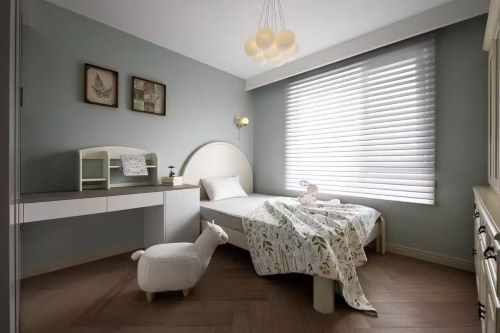 过道重组拆解的同时,我们把原主卧和南次卧进行空间置换,合理缩小原主卧的面积设为女孩房,把空间让给公卫。女孩喜欢蓝绿色,所以墙面选择了很清新的多乐士豆蔻青,带来平和纯净的感受。