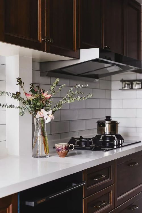 原厨房是个U型,空间局促,无法满足双开门冰箱的放置,于是我们重新规划空间布局,更改了入口朝向,依次与弧形阳台、餐厅串联起来,光线和空间得到拓展,让整体动线和隐私更好。