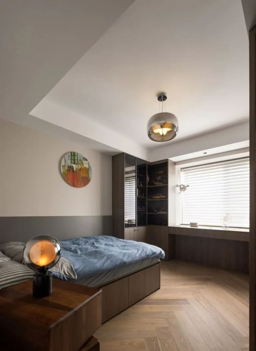 男孩房整体是灰咖色调,墙面双色相拼,让其产生很好的空间质感。床位于入门左边,右边是衣柜,搭配一个转角定制书柜结合飘窗设计的书桌,整个空间这样布置显得宽敞而整洁。机器人边柜、玩具手办、IKEA玛克弗洛复古装饰台灯、梵高《卧室》装饰画等点缀其中,让男孩房充满动感与活力。