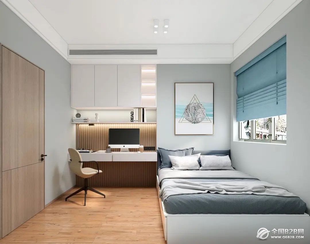 儿童房以软包的小床加转角收纳书柜来满足日常休息与学习的空间。这个空间虽然不大,但满足小次卧的多功能空间,集休息、学习、收纳为一体的空间设计。
