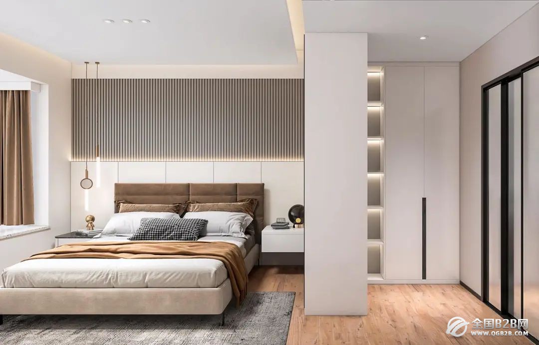 主卧设计考虑整体舒适性和实用性,床头背景形状通过白色墙板加上局部装饰金属,衬托出简单奢华的空间氛围。