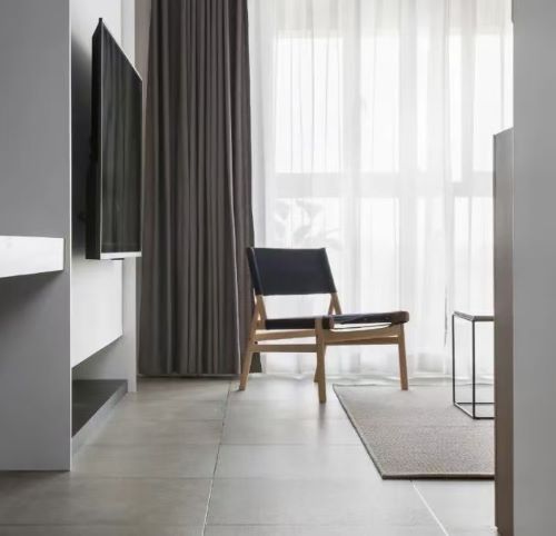 客厅用大白墙+浅灰地砖打底,清爽又显大!原木色家具点缀其中,立马有了温度感。天花板装几盏简约射灯,搭配灰色沙发窗帘,整个空间简简单单却特别有层次,一看就是会生活的样子。