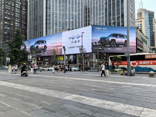 成都城区商圈LED大屏多设置于核心地段高楼外立面上,与建筑、商圈环境融为一体,兼具视觉冲击力与地标属性,品牌展示更具气势。