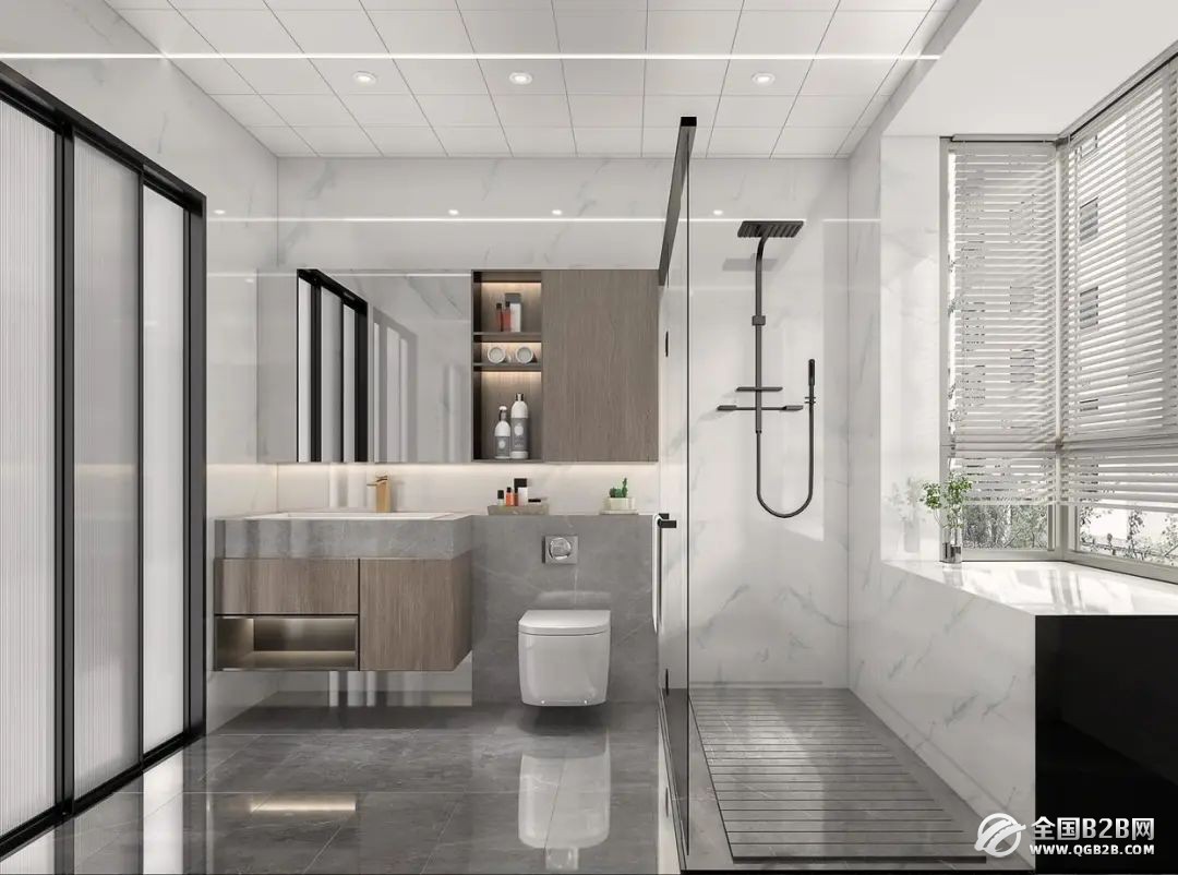 卫生间的设计以通透、明亮为设计前提,所以在色彩上运用了大理石灰白掉,整体大理石通铺,保证了空间的美观性之外,还防止潮湿、空间死角的现象。