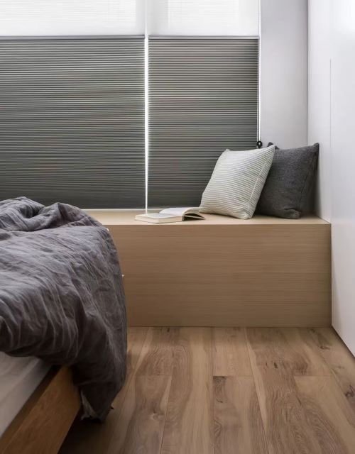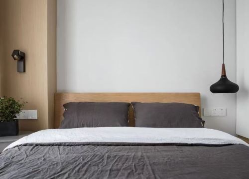 主卧铺上原木地板,配上大白墙和灰白床品,简简单单却特别有质感!原木色的衣柜和床头柜统一风格,整个房间温馨又放松,一进来就能卸下疲惫。